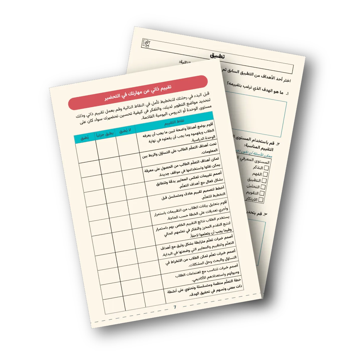لا يحتوي الدليل على خطط دروس جاهزة، بل يقدم لك إطارًا يساعدك في التحضير ويزوّدك بالخطوات التي تحتاجها للتخطيط بشكل فعال. الهدف من ذلك هو تشجيع المعلم على تصميم وتحضير خبرات التعلم بنفسه، لضمان أن تكون ملائمة لاحتياجات طلابه ومرتبطة بأهداف الدرس